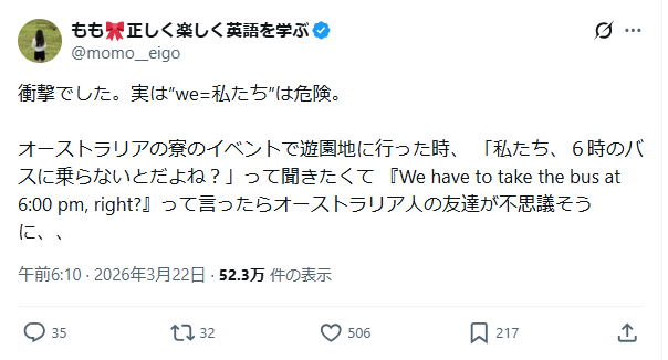 2026年3月、X(旧Twitter)で1.5万件以上のビュー(インプレッション)を記録した1つの投稿が話題になりました。オーストラリアに留学中の日本人大学生が体験した、たった1つの英単語をめぐるカルチャーショックです。