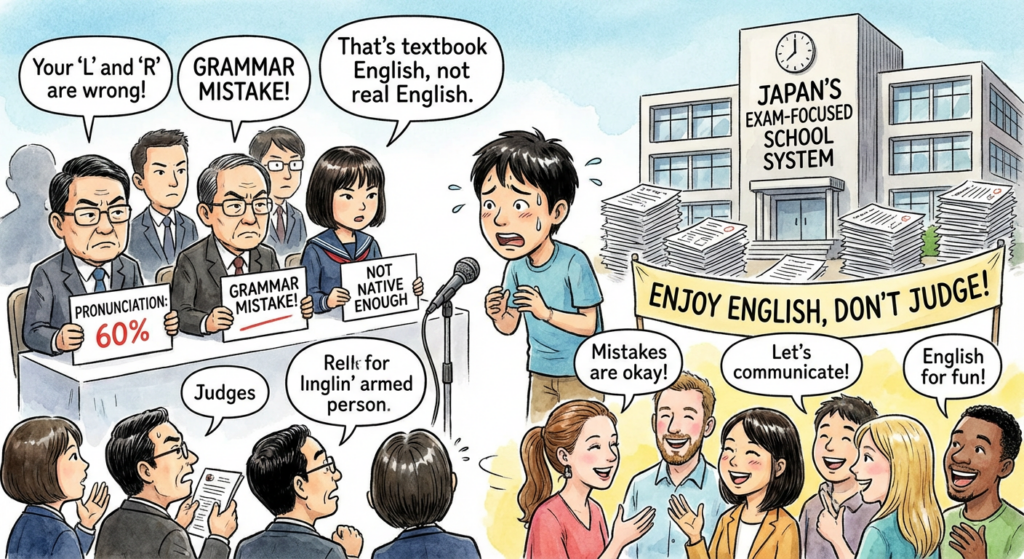 In Japan, English is a big part of school life. Students study hard for tests like TOEIC or Eiken. But there is a funny and sometimes annoying habit among Japanese people. They like to judge or rate other people’s English skills. For example, if someone speaks English, others might say, “Your pronunciation is not perfect” or “You made a grammar mistake.” This happens a lot on social media or in study groups.