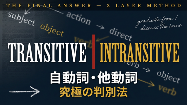 大学受験英語専門【原田塾】 【自動詞・他動詞の見分け方】「何を?」で見分けるのはもう古い?!自動詞・他動詞の"究極の判別法"を公開! 19/04/2026 haradaeigo 原田英語.com INTRANSITIVE vs TRANSITIVE — THE FINAL ANSWER 「何を?」で見分けるのはもう古い。 …