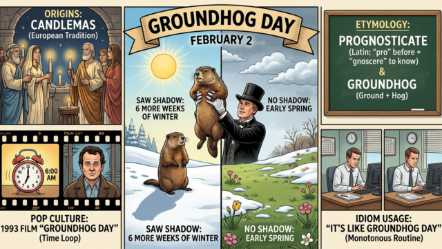 ミスター原田の超絶英語コラム Groundhog Day(グラウンドホッグ・デー)の意味とは?2月2日で英語の予知を学べ!【Mr.原田超絶コラム120】 2026-02-02 haradaeigo 原田英語.com Groundhog Dayの意味は?2月2日で学ぶ英語の予知 アメリカの伝統行事「Groundhog Da …