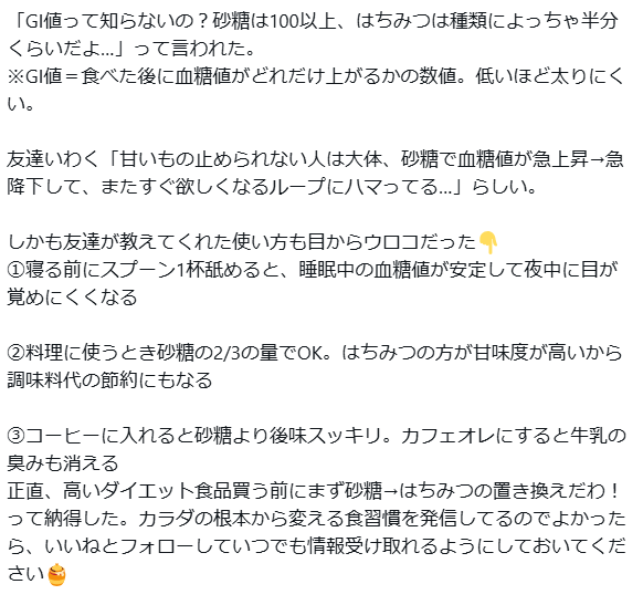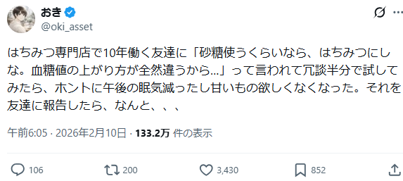 投稿主の@oki_assetさんが紹介したのは、「砂糖をはちみつに置き換えるだけで体が変わる」というシンプルなメッセージ。GI値の違い、寝る前のスプーン1杯、料理での置き換え比率……。わかりやすい体験談と具体的なTipsが支持を集め、いいね3,300超、ブックマーク800超という爆発的なエンゲージメントを記録しています。