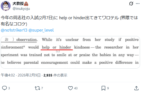同志社大学の入試(全学部統一日程・文系)を受けた受験生たちが試験会場を出たその瞬間から、X(旧Twitter)の英語教師・予備校講師界隈がざわつき始めました。