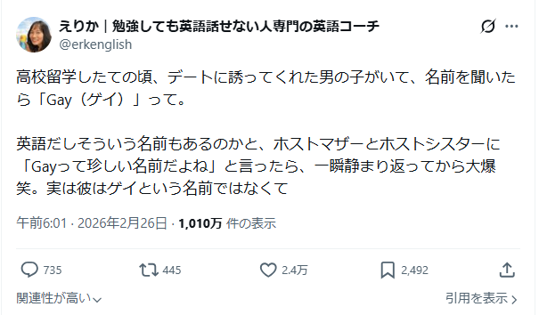 2026年2月、英語コーチのえりかさん(@erkenglish)がX(旧Twitter)に投稿した高校留学時代のエピソードが、1010万回以上閲覧される大バズを記録しました。