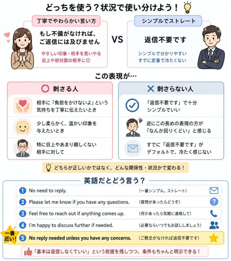 ✔ 英語の “No reply needed unless…” は構造的にほぼ同義
