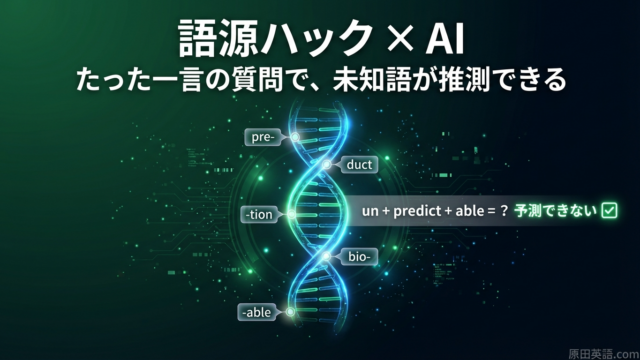 高校生×AI英語学習 【語源ハック】AIに「この英単語の語源は?」と聞くだけで未知語が推測できるようになる──実際の入試問題で試してみた 11/04/2026 haradaeigo 原田英語.com 🧬 ETYMOLOGY × AI STRATEGY AIに「この単語の語源は?」と 聞くだけで未知語が推測できるようになる 実 …