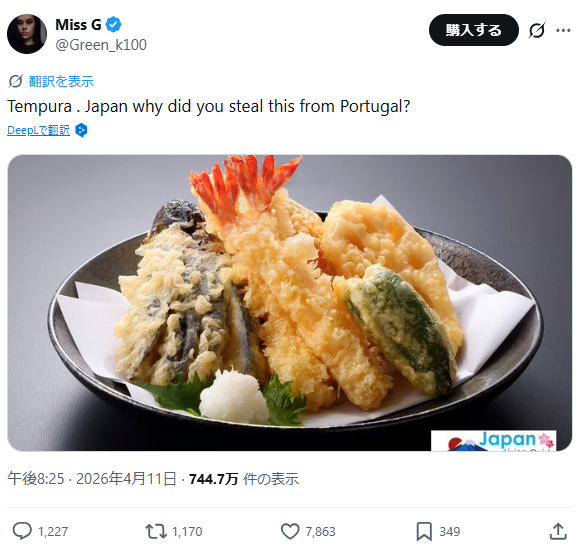 「日本に欧州から揚げ物文化が伝わったのは16世紀のことだよ。日本は天ぷらをポルトガルルーツの派生料理と紹介していて、日本独自の食べ物だなんて主張していない。そもそも『天ぷら』の語源がポルトガル語の tempero 由来だからね。」