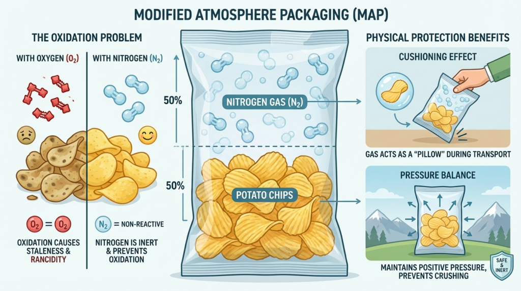 First, the gas inside the bag is not air. It is nitrogen. About 78 percent of the air we breathe is nitrogen, so it is completely safe. But why not use regular air? Because air contains oxygen. Oxygen reacts with the oil on the chips and makes them go bad. This chemical process is called oxidation. It changes the taste and smell. Chips become stale and unpleasant. Nitrogen does not react with food at all. It keeps the chips fresh and crispy for months.